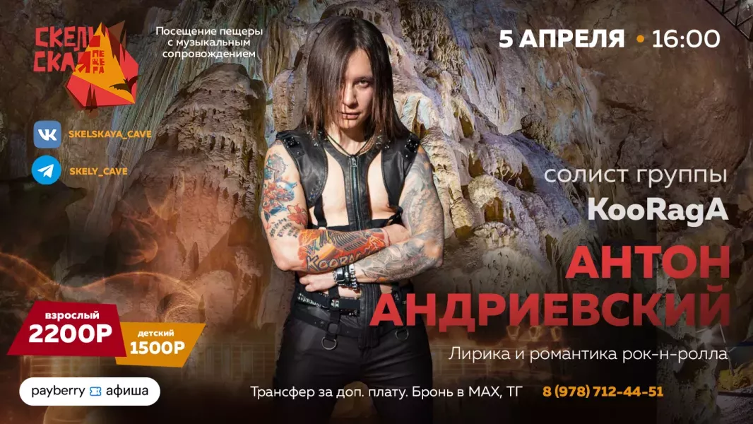 Романтика подземного мира в ритме рок-н-ролла. Уникальное акустическое путешествие в Скельской пещере — вечер, который перенесет вас на много лет назад в золотую эру рок-музыки. Солист группы KooRagA Антон Андриевский представит программу «Лирика и романтика рок-н-ролла». Рок-исполнение в древней пещере — редчайшее событие, где природная магия усиливает впечатление от музыки.