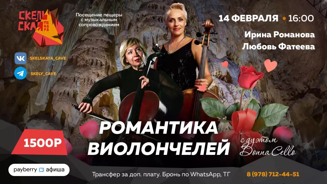 Дуэт «Donna Cello»: Любовь Фатеева и Ирина Романова. Самые нежные и страстные мелодии в живом исполнении под сводами древних скал — от классических любовных баллад до современных хитов. Проникновенная музыка, усиленная уникальной акустикой пещеры, создаст эффект полного погружения в сказку.