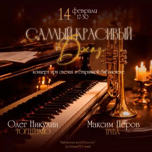 Приглашаем на камерный вечер джаза в уютной атмосфере библиотеки им.Л.Н.Толстого, освещённой мягким светом свечей. В этот вечер прозвучат самые красивые и любимые джазовые мелодии, которые уже не одно десятилетие вдохновляют, согревают и будоражат сердца. Фортепиано и труба создадут живой диалог, наполненный теплом, ритмом и драйвом.